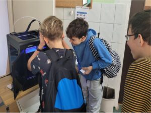 Starsza grupa uczniów poznaje budowę drukarki 3D i tworzy trójwymiarowe projekty breloczków z imieniem.