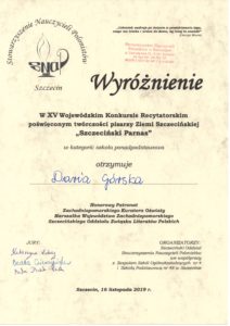 XV „Szczeciński Parnas” zakończył się dla naszej uczennicy, Darii Górskiej, sukcesem: otrzymała wyróżnienie szkół ponadpodstawowych