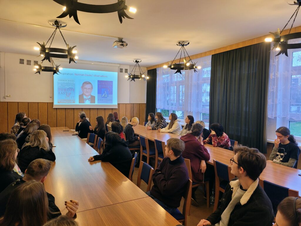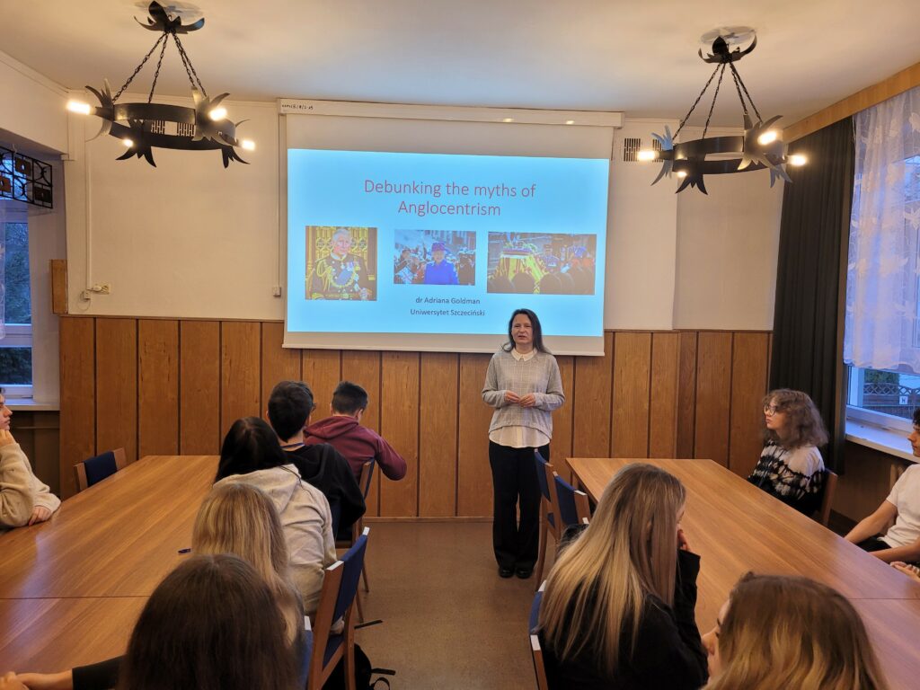 Z okazji Tygodnia Europejskiego mieliśmy zaszczyt gościć w naszej szkole wykładowczynię Uniwersytetu Szczecińskiego Wydziału Filologii Angielskiej Panią dr Adrianę Goldman, która przeprowadziła wykład dla uczniów klas dwujęzycznych pt.”Debunking the myths of Anglocentrism”. Czy Elżbieta II była królową Anglii? Po co Brytyjczykom cztery narodowe drużyny futbolowe? Czy termin „splendid isolation” ma dziś rację bytu? Czy jest coś takiego jak akcent brytyjski? Podczas wykładu Pani Doktor starała się odpowiedzieć na te i inne pytania dotyczące stereotypów związanych ze Zjednoczonym Królestwem.