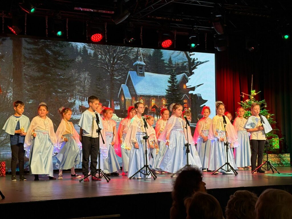 Na zdjęciach widnieją uczniowie występujący podczas koncertu świątecznego.